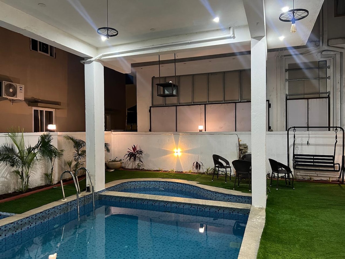 Un palacio construido con 7 dormitorios, magníficos jardines, una hermosa piscina con salas de juegos de última generación. Cocinas vegetarianas y no vegetarianas separadas. Servicio las 24 horas con un cocinero y un cuidador en la casa. Amplias habitaciones con las mejores sábanas. Servicios de catering disponibles para grandes fiestas y eventos. 22000 pies cuadrados es el área construida, por lo que es perfecta incluso para grandes reuniones y bodas, etc. Carril privado dedicado que garantiza la privacidad para todos.