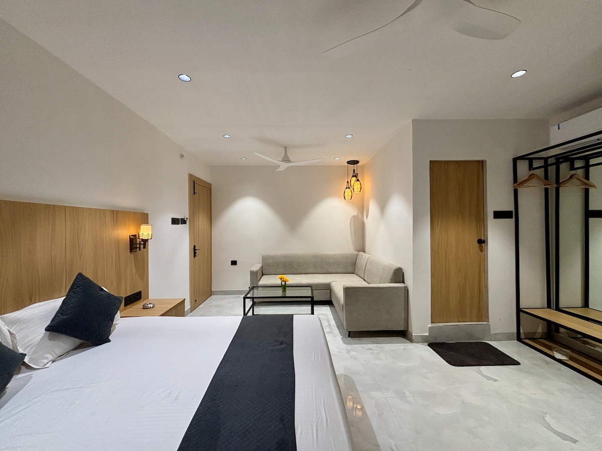 Spacious Premium Suite at Bilasa Park Inn Relax in comfort with a king-size bed, cozy seating, modern interiors, and all essential amenities. Perfect for couples, families, or business travelers located uslapur railway station for easy access to markets and attractions.