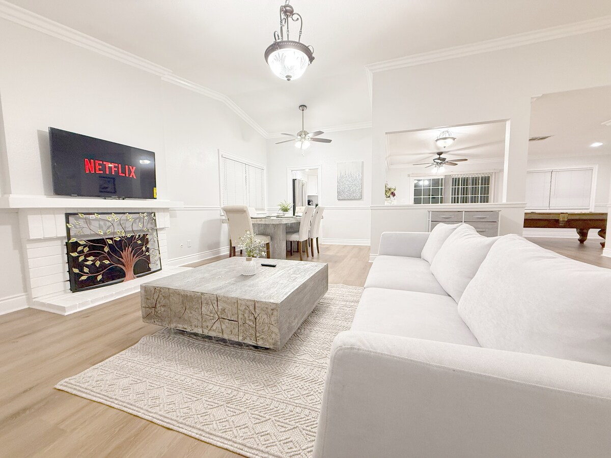 Esta hermosa casa remodelada se encuentra en un callejón sin salida seguro y tranquilo y ha sido amueblada con buen gusto con todos los muebles nuevos. Puede alojar cómodamente a 8 huéspedes con 4 dormitorios, estación de trabajo dedicada, internet de fibra óptica de 1 Gig, una cocina bien equipada y surtida, dos cómodas salas de estar, dos televisores de 55 pulgadas, un hermoso comedor, chimenea, amplio comedor al aire libre, chimenea, parrilla de gas para tu placer de cocinar al aire libre, zona al aire libre bien iluminada, lavandería interior, aire acondicionado central y calefacción y mucho más.