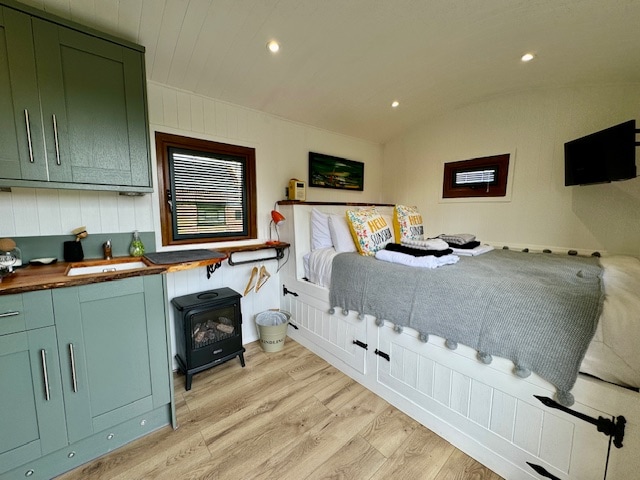 Situated along the River Severn, Mooffitch Garage Shepherd Hut is a short drive into Gloucester city centre and only 20 minutes to the Forest of Dean. The hut is one of two huts situated by the river. It is well equipped with a built-in king size bed, TV, hob, microwave, toaster, mains shower and wc. There is romantic festoon lighting in the evening and a hot tub to use at your convenience. The property boasts stunning views of the river.