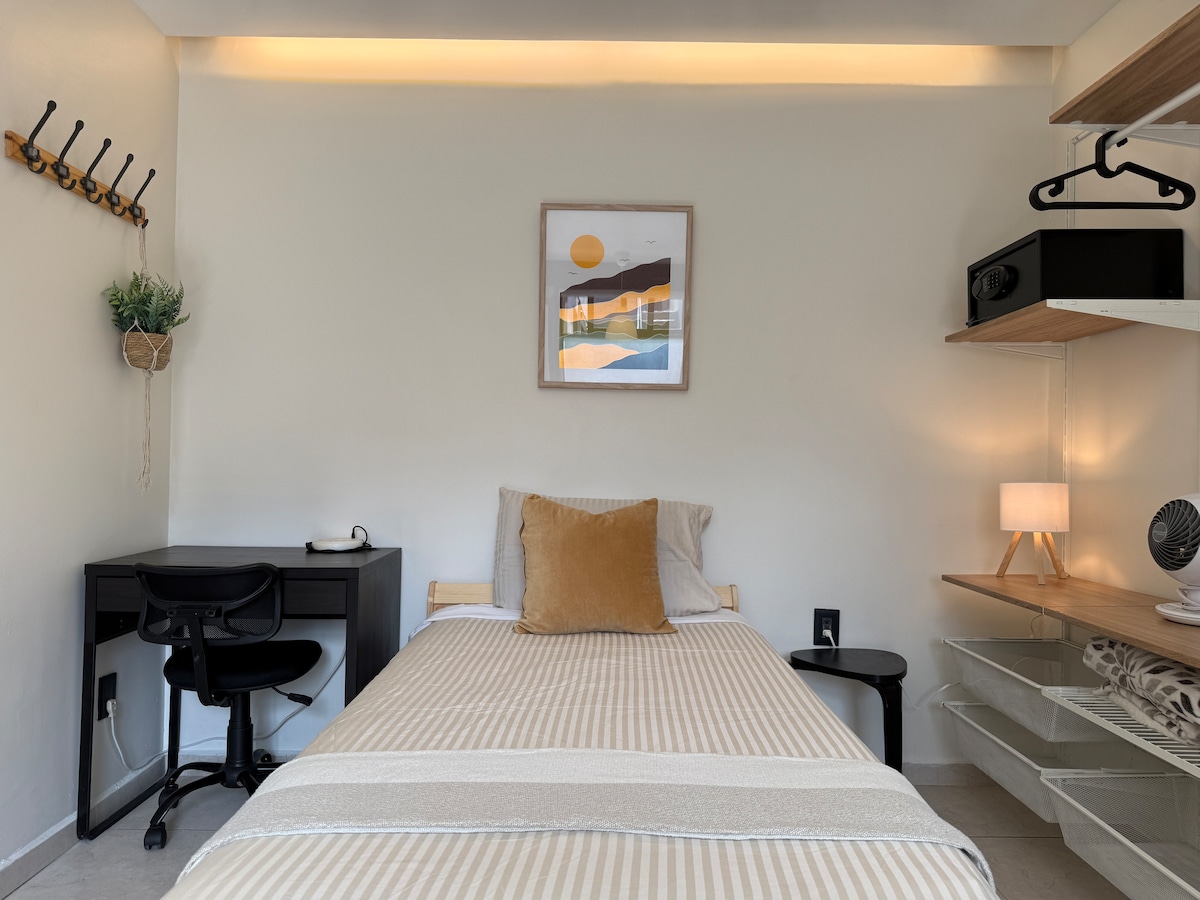 Disfruta de este Loft práctico y cómodo a 10 minutos del Aeropuerto de la Ciudad de México, Estadio GNP/Autódromo, Palacio de los deportes, Terminal de Autobuses TAPO Centro Comercial Oceanía/IkEA con cafés, bares, restaurantes, cines y tiendas. El Loft se está ubicado en segundo nivel, con cama individual, Cocina equipada, TV ROKU , escritorio, caja de seguridad Wi-Fi y baño privado. El edificio cuenta con Lavadora y Roof Garden de uso compartido. Frente al edificio hay un parque.