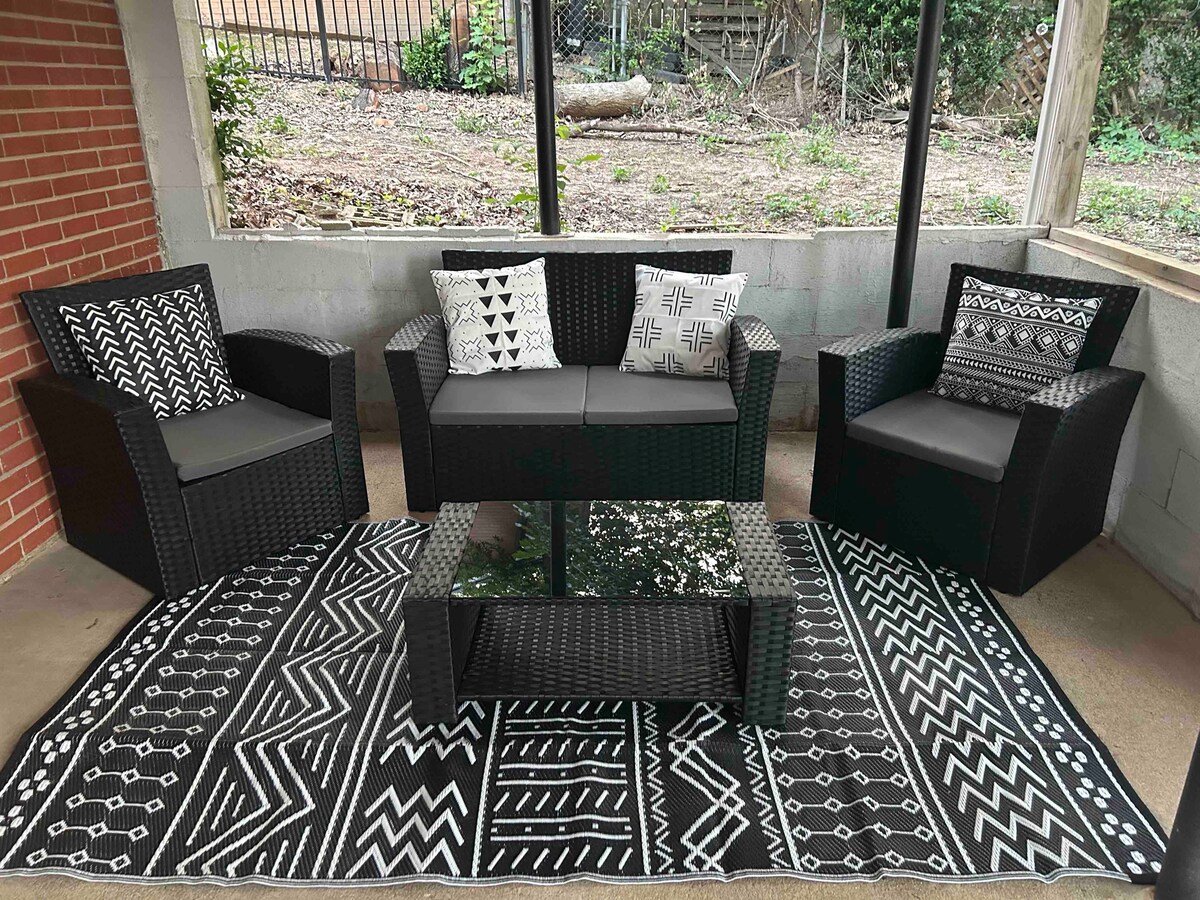 3 dormitorios y 1,5 baños. El dormitorio principal tiene cama tamaño king, vestidor y medio baño propio. La habitación de invitados tiene cama doble y vestidor. A minutos de Fort Campbell, el centro de Clarksville y el centro comercial Governor's Square. A 45 minutos del aeropuerto de Nashville. A poca distancia a pie del mercado de Walmart del barrio. Lavadora, secadora y nevera nuevas. Wifi de alta velocidad, televisores de pantalla grande con Roku y café Nespresso. ¡Relajante terraza que da a un paraíso boscoso! Cargador de pared Tesla de 50 amperios.
