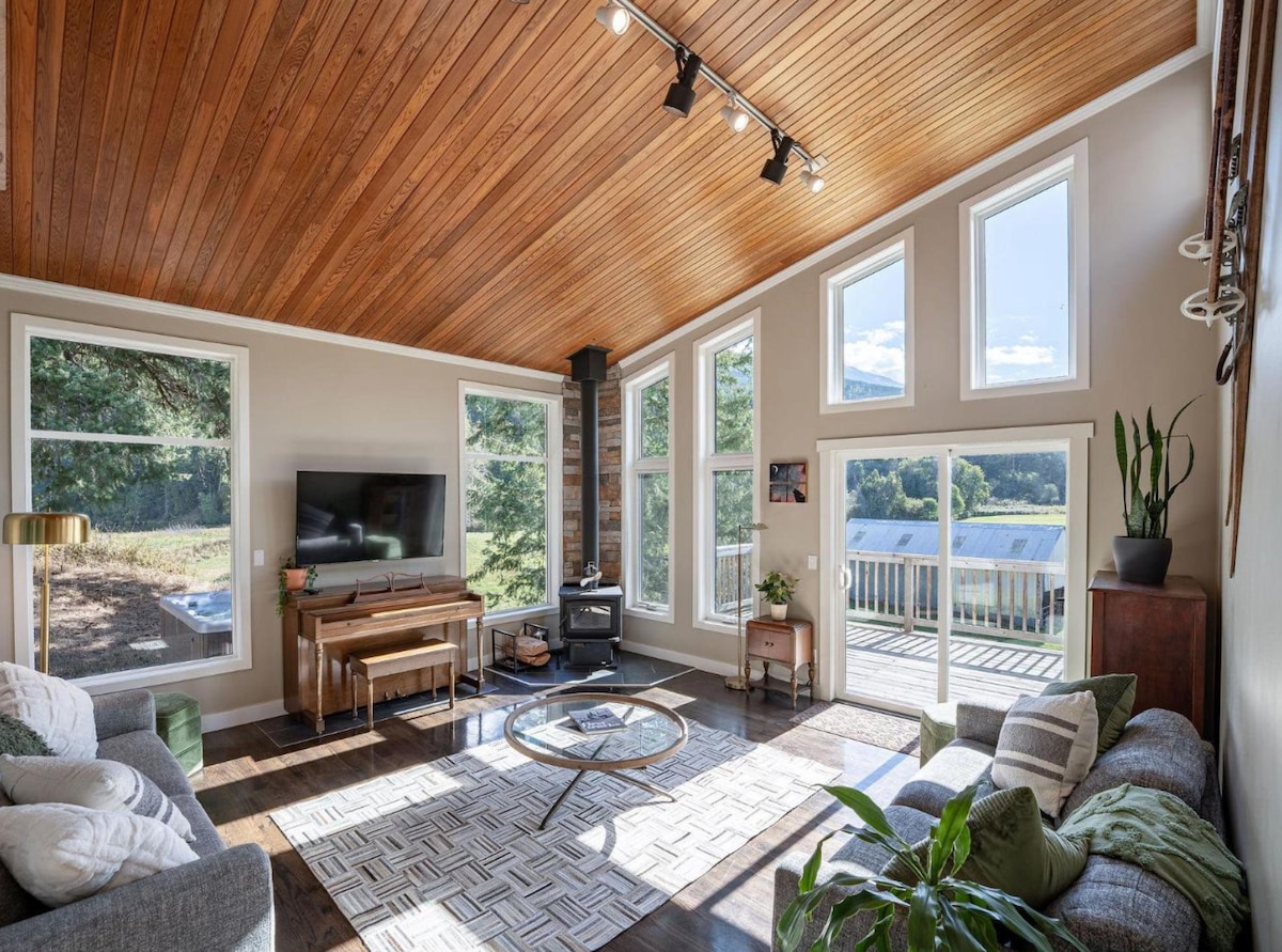 ¡Tus aventuras de invierno te están llamando! Ven y disfruta de nuestro Airbnb de nueva construcción ubicado en las orillas del río Columbia con vistas a Mackenzie y Boulder Mountain. Nuestro lugar incluye una habitación king con baño privado y 3 acogedores dormitorios con baño completo compartido, cada habitación está equipada con camas tamaño queen y camas dobles en nuestros lofts. ¡Los huéspedes tienen acceso a nuestro garaje doble climatizado, así como a nuestra sala de estar al aire libre con nuestra terraza envolvente, a la nueva bañera de hidromasaje del spa Passion Joy y a la barbacoa y a la combinación de fumadores!