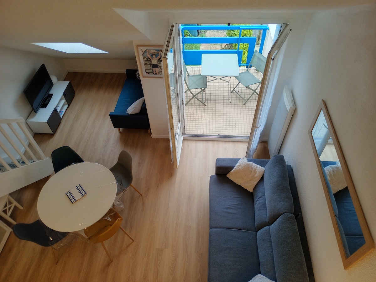 ¡Hola! Ofrecemos un apartamento ideal para pasar unas hermosas vacaciones en el mar y con una ubicación ideal para disfrutar de las ventajas de Concarneau. El apartamento consta de un altillo con una cama doble y el baño y en la planta baja, un pequeño dormitorio con una litera, la sala/cocina y los aseos. La cocina está equipada con dos placas vitrocerámicas, un lavavajillas y un horno microondas. Un armario está a su disposición para sus cosas.