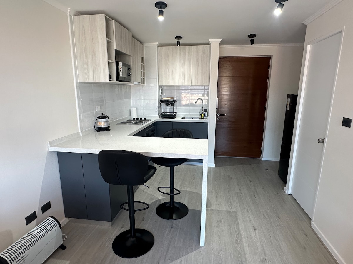 Disfruta de este departamento nuevo, full equipado para dos personas, cerradura inteligente, céntrico y muy cómodo, ideal para alojarse en Concepción. A pasos de la Universidad de Concepción, Hospital Regional, Tribunales, etc El edificio cuenta con Seguridad conserjería 24/7, Circuito Cerrado de Tv, Estacionamiento privado Subterráneo y Lavandería del edificio