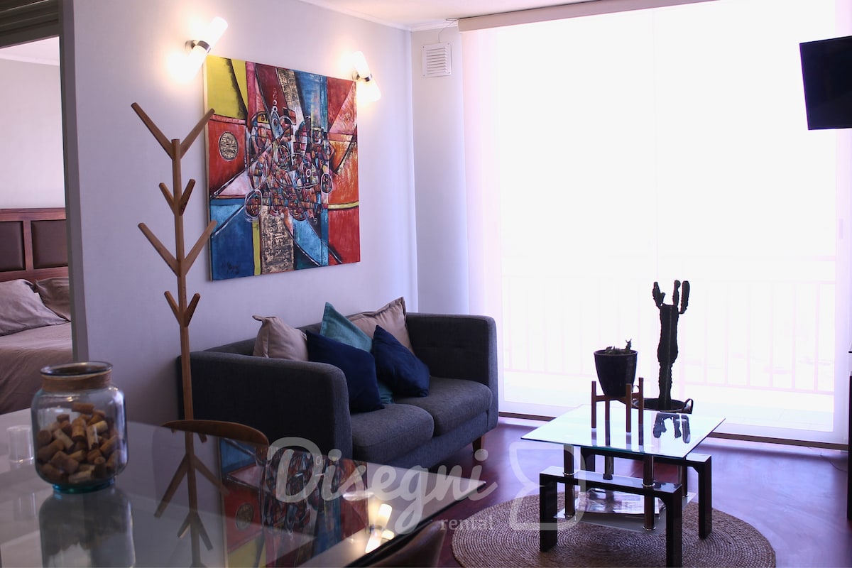 Luminoso y cómodo departamento totalmente amoblado en el centro de Copiapó. Desde este se puede apreciar su valle. A la vez, rodeado de centros comerciales (banco, supermercado, farmacias, estación de servicios y otros). Los cuales no irrumpen con la tranquilidad, siendo un espacio muy acogedor, por el cobijo del sol, ubicación y utensilios que ofrece. Locomoción en la misma cuadra. Cuenta con estacionamiento dentro del edificio, conserjería 24 hrs, ascensor, acceso a piscina, quincho.