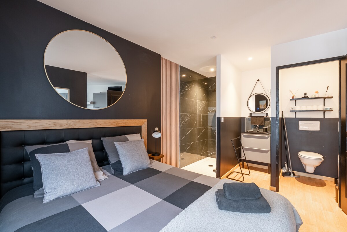Accesible las 24 horas a partir de las 16:00. Casa de 50 m2 en pleno centro de la ciudad totalmente renovada en enero de 2022. Gran habitación de 20 m2, salón de estar de 25 m2 con cocina equipada Proporcionamos sábanas, toallas y café/té para el desayuno. Estamos totalmente disponibles (viviendo en la casa de al lado) para darle la bienvenida, aconsejarle o recibirle con una copa si lo desea.