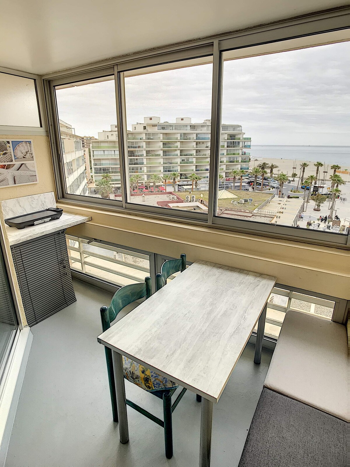 Estudio con vistas al mar en el quinto piso con ascensor. Acceso para discapacitados Tiendas y playa a 50 m.Cocina equipada con frigorífico superior, placa de inducción, grill microondas, cafetera de filtro y senséo. Sofá cama (145 x 195), TV, aire acondicionado reversible, WIFI. Balcón cerrado equipado con plancha. 2 literas. Lavandería, minimercado cercano. Tarjeta de acceso Aparcamiento subterráneo a 500 m gratuito del 1/6 al 30/9. Sábanas y toallas bajo petición con coste extra (10€/pers).