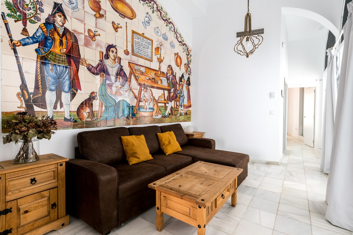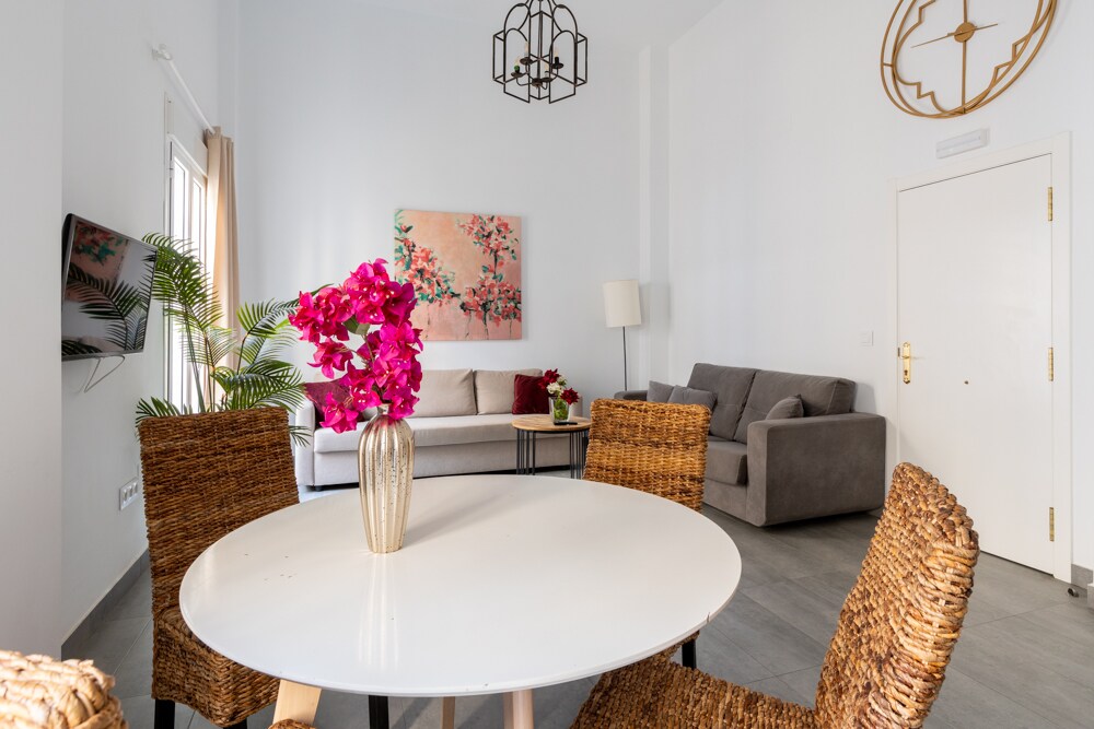 Luminoso apartamento con mucho encanto ubicado en una casa palacio llena de luz, a un minuto de la Plaza del Cabildo. El edificio dónde se ubica está recién reformado mezclando el estilo andaluz con la modernidad y la elegancia. El apartamento está pensado para que disfruten de la ciudad familias o amigos, a nadie les dejará indiferente.