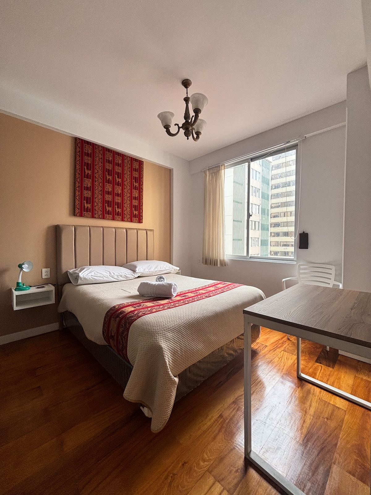 Apartamento de un dormitorio ubicado en Sopocachi, un barrio tranquilo en el centro de la ciudad. Cerca de todos los lugares importantes, zona turística, farmacias, bancos, tiendas, pubs, cafés y restaurantes. A 12 minutos de Teleférico Sopocachi y a 6 minutos de la Avenida Principal de la ciudad Av. 16 de Julio “El Prado”. > Internet Wifi : 60 MB(abajo) - 25 MB(arriba) > Calefacción central (por la noche con horario) > Netflix > Enchufes de pared universales > Vista panorámica de la ciudad > Cámaras de seguridad