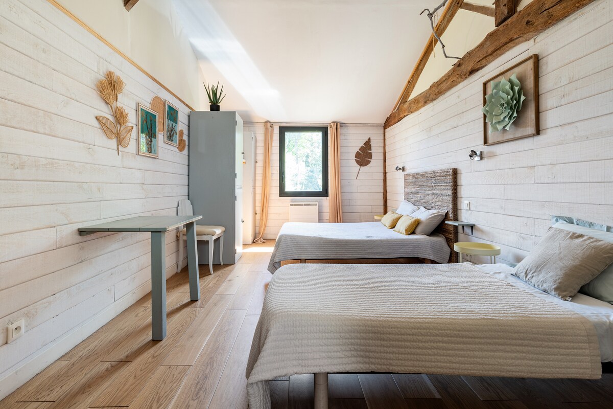 @lapetitebourdotte: Alojamiento recién renovado , este antiguo granero en el corazón de un parque paisajístico compartido único sabrá satisfacer sus deseos de tranquilidad y campo con las ventajas de lo moderno . Dos dormitorios , con cama doble grande ( 160 ×200) Excelente ropa de cama . En temporada, piscina 8x3 con sal, climatizada y compartida (9h/11: 14: 00/17: 00/17: 00. A petición, clases de Pilates mate y máquinas, así como masajes antiedad faciales japoneses ( Ko-Bi-Do ).
