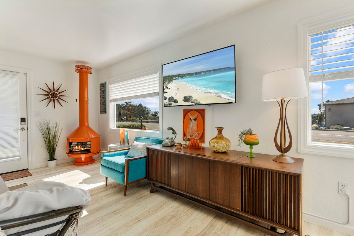 A solo 10 MINUTOS del antiguo bosque de secuoya, el Starlite Inn es un bungalow dúplex único FRENTE AL MAR, con un carácter elegante de mediados de siglo. ¡A los huéspedes les encanta la chimenea naranja vintage Preway/Malm, la consola estéreo vintage modernizada de 1960 compatible con Bluetooth, la máquina Nespresso y muchas otras ventajas de inspiración vintage que descubren a lo largo del camino!