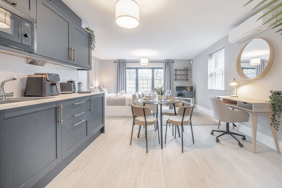 Luminosa y moderna sala de estar de planta abierta y cocina con barra de desayuno, lavadora, lavavajillas, cocina y nevera. Dormitorio doble con espejo de cuerpo entero y un gran y elegante baño privado. Puertas del patio desde la sala de estar y el dormitorio al patio y jardín compartido. A 45 minutos de Londres o Brighton. Puedes ir caminando a los campos cercanos. Tierras y propiedades del National Trust cerca, a poca distancia en coche del castillo de Hever, la casa de Churchill Chartwell y mucho más. Aparcamiento gratuito en la calle exterior.