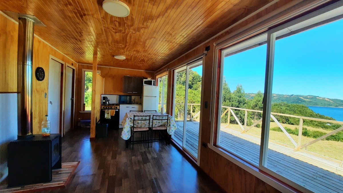 Cabañas nuevas y equipadas completamente, la cual tiene la comodidad necesaria para descansar y conocer la isla, ubicada en el corazón de chiloe, cuenta con una vista maravillosa y espectacular hacia la cordillera de los andes y archipiélago de chiloe. También zonas cercanas para trekking, running, nadar, andar en bicicleta y kayak.