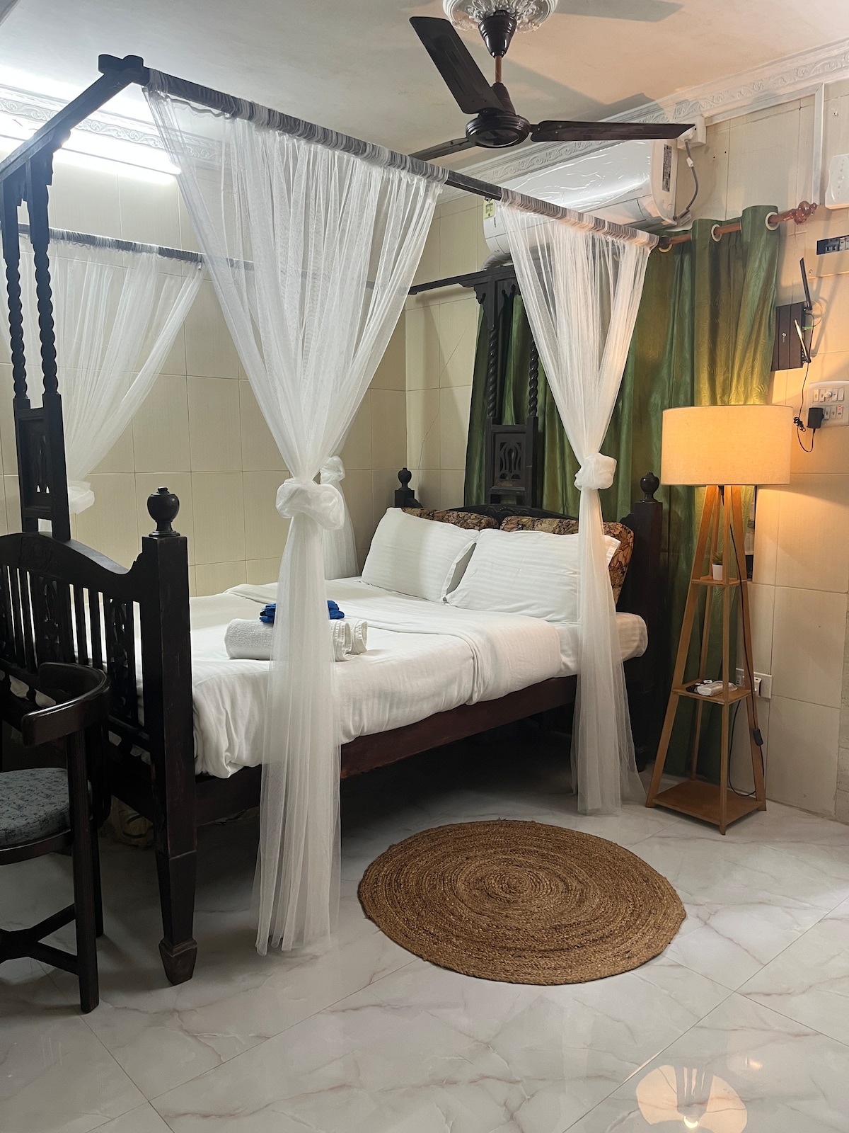 Apartamento de 1 dormitorio, amplio y luminoso, con techos altos, ventanas altas de estilo europeo, cocina totalmente equipada y 2 baños. A pasos de Farmer's Café, Linking Road y auto-rickshaws, en uno de los barrios más geniales de la India. • Piso en la 1.ª planta • Interiores de temática africana • 1 dormitorio espacioso con 2 baños • Balcón. • Aire acondicionado dividido en la sala de estar y el dormitorio • Televisión inteligente de 43 pulgadas • Wifi de alta velocidad • Servicio de estacionamiento. • Traslado al aeropuerto, comidas y otros servicios disponibles