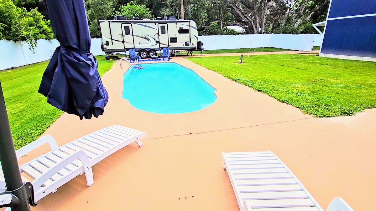 La casa de huéspedes en 3 Ponds Farm se encuentra en el centro de Florida, en una granja familiar de 22 acres, al final de un camino rural de grava. La casa es privada y aislada, situada bajo majestuosos robles que gotean en musgo español, y es conveniente tanto para los parques de atracciones populares como para los hermosos manantiales naturales y la vida silvestre de Florida. Disfruta de la piscina (no climatizada) de la fogata y los juegos del patio La casa de huéspedes es perfecta para unas vacaciones familiares, una escapada de chicas, un viaje de pesca o para celebrar un aniversario romántico.