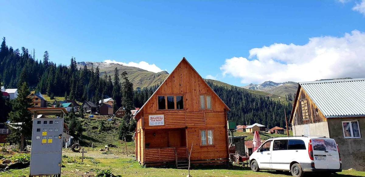 La casa de campo «Sabri» se encuentra en la estación de Goderdzi, cerca del telesilla central. No necesitas transporte adicional para desplazarte. El interior de la casa está equipado con todos los suministros que necesitas: tres dormitorios, estufa de leña, calefacción eléctrica en todas las habitaciones, cocina totalmente equipada. TV por Internet. La casa es de madera y está rodeada de metal especial para el calor. El agua es especial y fluye desde el suelo. Todas las habitaciones son cómodas, y hay 6 personas y pueden ser más.