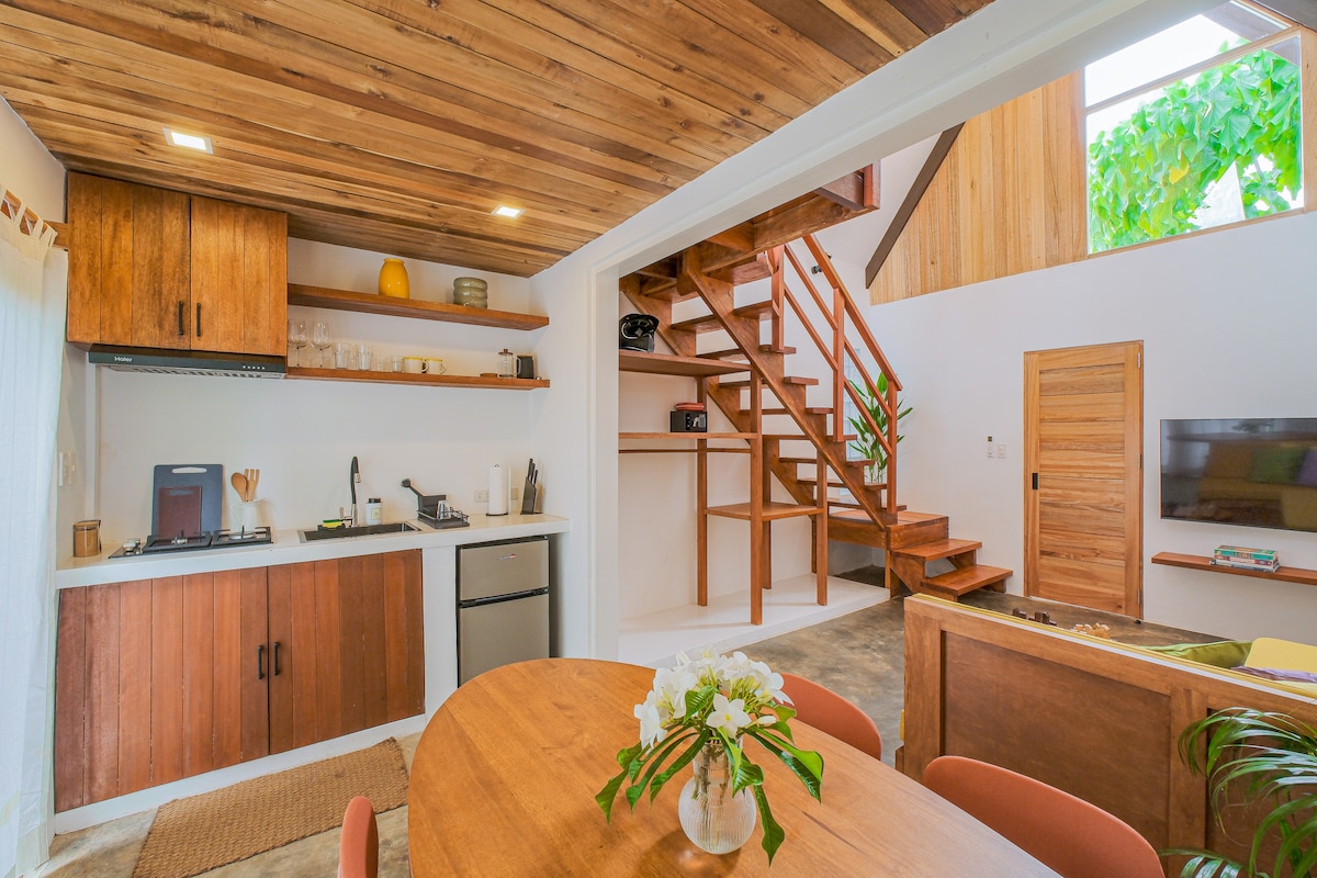 Relájate en esta elegante habitación inspirada en la isla, que combina la comodidad moderna con texturas naturales. Perfecto para parejas o viajeros solitarios, el espacio cuenta con una cómoda cama, iluminación suave y un ambiente sereno. Sal a un exuberante jardín bordeado de plantas tropicales y disfruta de un refrescante enjuague en la única ducha exterior de bambú. Ubicado en un rincón tranquilo de la isla, a pocos minutos de la playa y de los lugares locales.