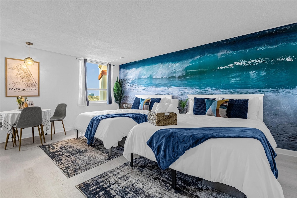 We are one of the closest airbnb to the boardwalk, OnThe Worlds Most Famous Beach with an open Pool 65inch Tv Come enjoy our Newly Furnished Studio with Amazing Top Floor Beach Views. We are the Closest AIRBNB on the Beach to the Daytona International Speedway With king bed and Queen sleeper sofa. Centrally located in the Heart of Daytona Beach. walking distance to the Pier Boardwalk, Restaraunts, and Main Street We have FREE parking for 1 vehicle and provide Coffee,Cream,Sugar,bch chairs