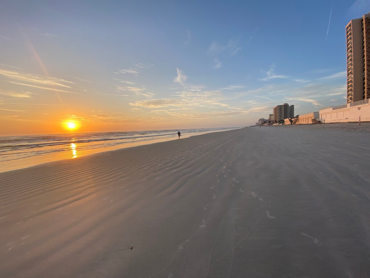 NIGHTLY PRICE REDUCED due to Building renovations restricting our balcony usage. There is no access to the balcony currently and the view will obstructed*. ON THE BEACH! Your very own cozy spacious studio in Daytona Beach Shores is the serene beach of Daytona and just a few short minutes away from a variety of activities and restaurants. Our 6th-floor unit is completely remodeled with free dedicated 45+Mbps WiFi, a full kitchenette, and free parking. *Our balcony is unavailable until April.