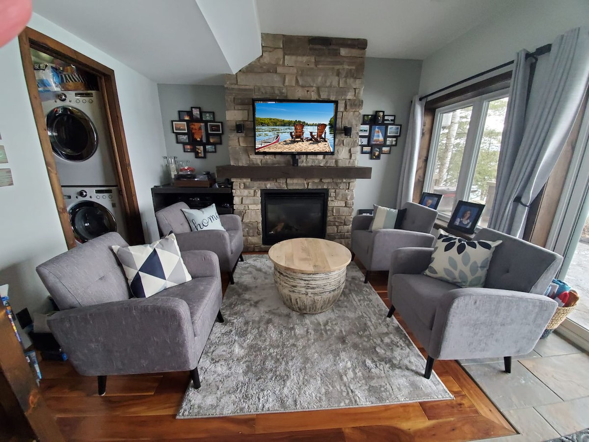 Relájate en esta cabaña privada, apta para mascotas, frente al lago durante todo el año, con 4 dormitorios y 2 baños completos, ideal para familias o grupos pequeños que buscan una escapada relajante. A solo 5 minutos de las tiendas, cafeterías, spas y una fábrica de chocolate local de Lakefield. Diseñado con esmero y totalmente equipado para una escapada acogedora y sin preocupaciones. La sauna es de leña para usar, encienda un fuego en la cámara y deje que se queme durante 30 minutos. Jacuzzi agregado en mayo de 2025 (hasta 7 personas) Solo aceptamos reservaciones de huéspedes con evaluaciones positivas en Airbnb.