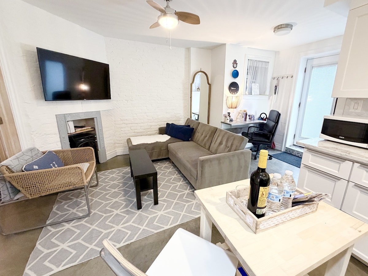 ¡Los artistas y creativos son bienvenidos! Alójate en nuestra casa adosada de 1920 con su mezcla de textiles de la época de los 70 y estilo contemporáneo. Por favor, entra en el pasillo compartido y busca la entrada a tu apartamento a la derecha. Frente al perchero. Moon Base (ment) es el apartamento privado completo de nivel inferior, con cocina totalmente equipada con vitrocerámica, lavavajillas, triturador de basura, cómoda cama doble, baño privado con ducha, lavandería y tu propio patio junto a la cocina y acceso a un pequeño patio con iluminación.