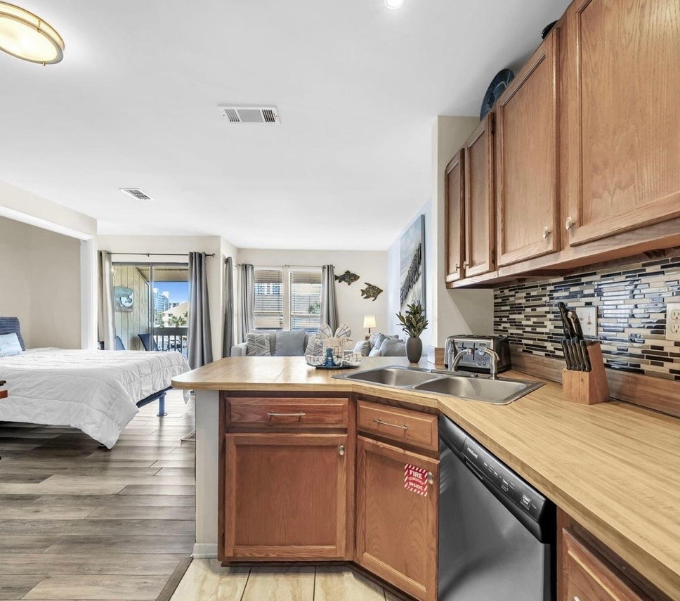 Apartamento de 1 dormitorio y 2 baños recientemente renovado con literas incorporadas. Situado junto a la playa, en el piso 19, con impresionantes vistas panorámicas a las aguas esmeralda y las playas de arena blanca prístina del golfo de México. Cocina totalmente surtida con nuevas encimeras de granito y electrodomésticos de pizarra. Internet de alta velocidad fiable y rápido en todas partes. Los servicios del centro vacacional incluyen una gran piscina y jacuzzi, un bar tiki junto a la playa que sirve bebidas heladas y cerveza. Una fabulosa cafetería que sirve desayunos calientes, pizza, sándwiches y ensaladas.