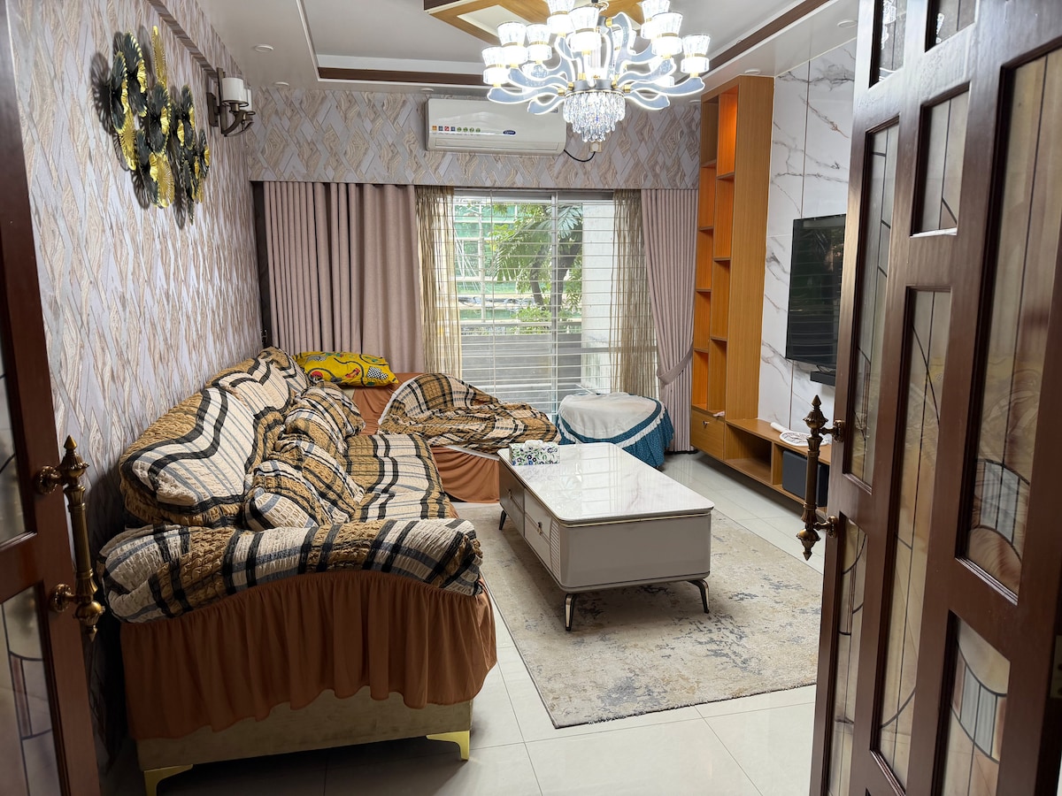 Stunning 1600sq ft 3 bedroom & 3 balcony modern apartment home with 3 king size beds. This stylish home offers high-end amenities like AC, unlimited WiFi, TV’s. Prepare home cooked meals in our state-of-the-art luxurious open kitchen. Relax in our comfy living room and drawing room with your family and enjoy a movie night together in high end furniture & hotel- grade luxury bedding! Reserve now for an elevated vacation experience! Step into a space where sophistication meets modernity at Sheza.