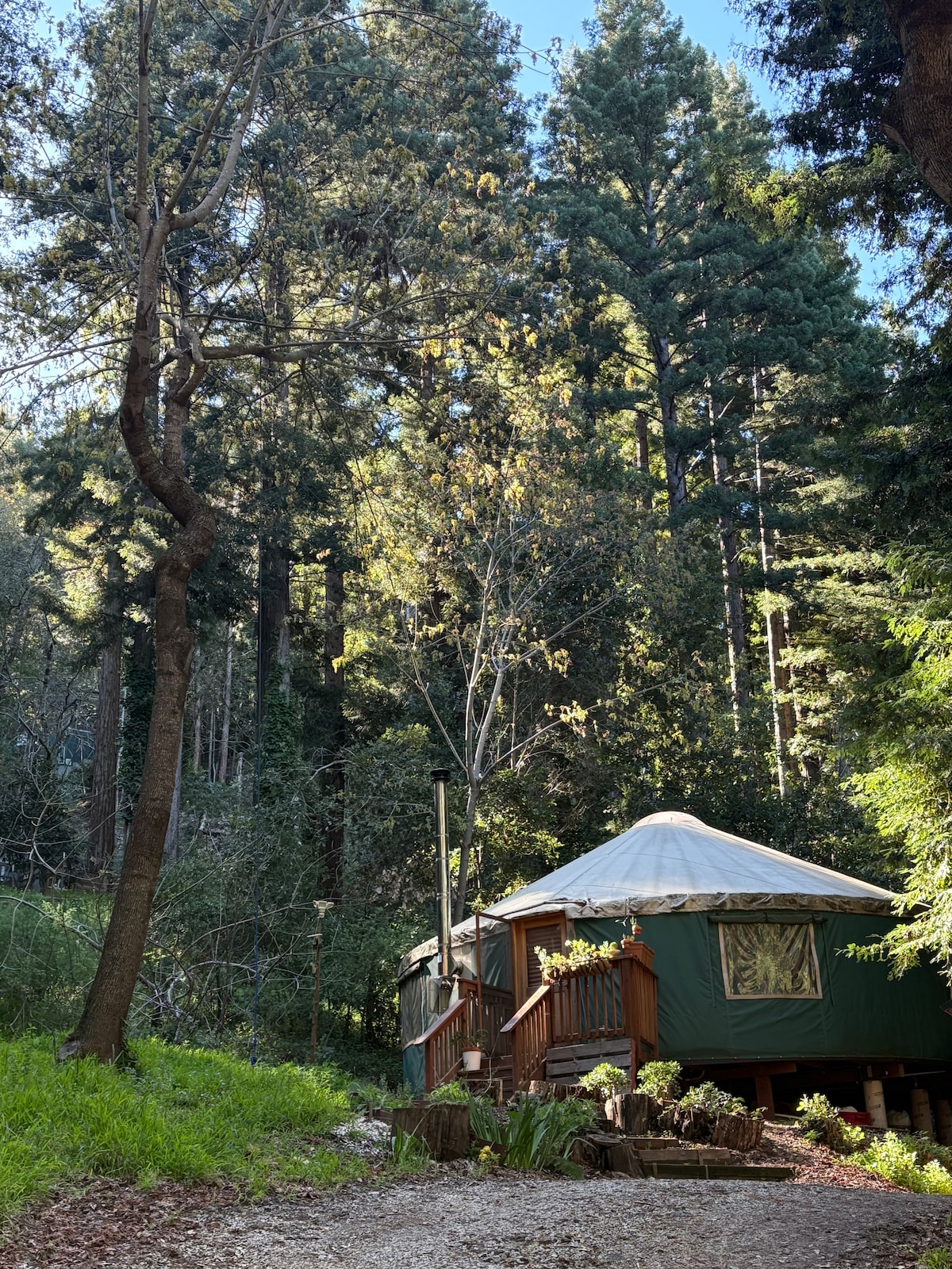Yurta de 24 pies tranquila, limpia, espaciosa, bellamente decorada y silenciosa completamente rodeada de secuoyas en la cima de las montañas de Santa Cruz. Pasa un par de días meditando, leyendo o escribiendo el próximo capítulo de tus memorias. A poca distancia a pie del Centro de Retiro Mount Madonna (abierto ahora solo con reserva). Rutas de senderismo y paseos a caballo por el parque del condado situadas a menos de 3 millas. Lugar ideal para fotografía y ciclismo de montaña/carretera.