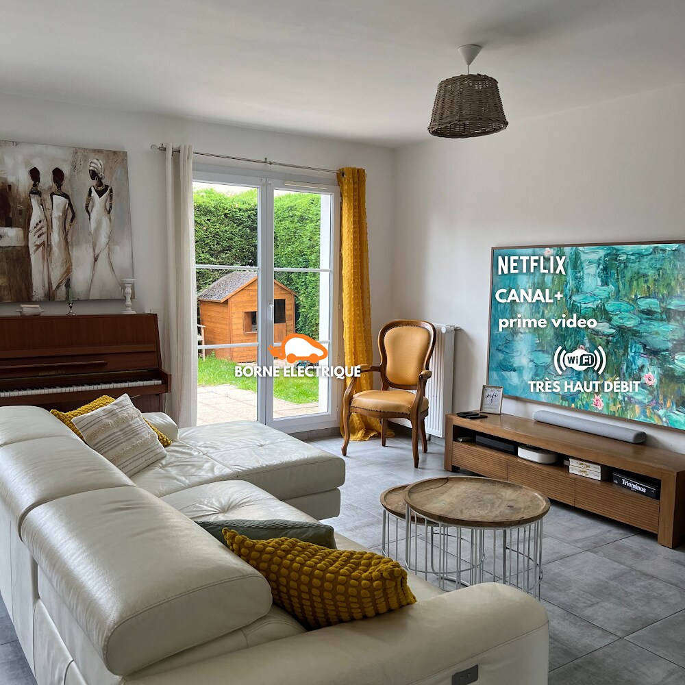 Pequeña casa con aire acondicionado, entrada independiente con capacidad para 4 personas. Cerca de 50 m2, 2 dormitorios, 2 camas de 160 cm, 2 baños, 2 aseos, una sala de estar con cocina americana, horno microondas, nevera, lavavajillas. Wifi de alta velocidad. Terraza con jardín suroeste cerrado de 23 m2 privado. Libros, juegos, sin televisión. Terminal de coche eléctrico de 5 a 7,2 kW según modelo, toma tipo 2 de pago en el lugar. Posibilidad de aparcamiento privado cerrado para bicicletas y motocicletas bajo petición.