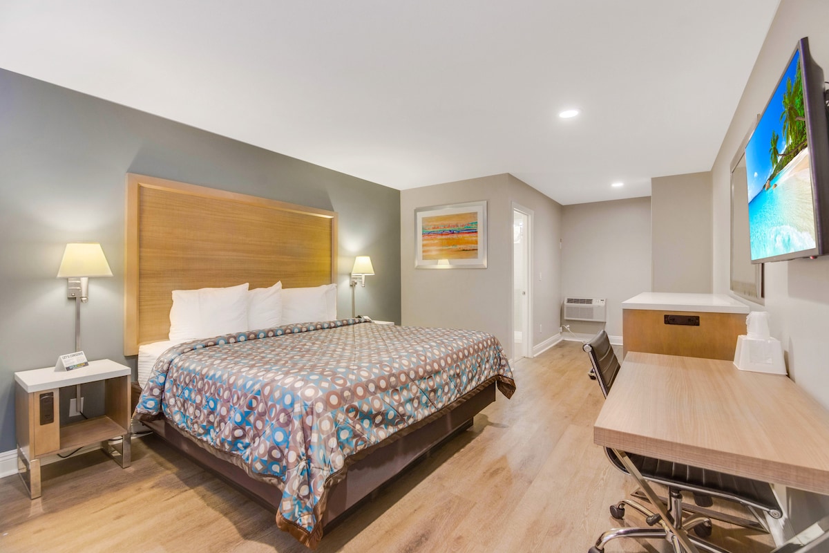 ¡Encantadora habitación de hotel boutique cerca de Disneyland®! Disfruta de un espacio limpio y moderno con una cama tamaño king, baño privado, wifi gratuito y aparcamiento gratuito. Camina o comparte coche fácilmente hasta Disneyland® Resort y el Centro de Convenciones de Anaheim. A los huéspedes les encanta nuestro tranquilo hotel de estilo boutique con un ambiente local y una excelente relación calidad-precio. Como vendedor autorizado de entradas para Disneyland®, ahorra hasta 25 $ en pases de varios días para el parque. ¡Cerca de restaurantes y cervecerías de Anaheim Packing District!