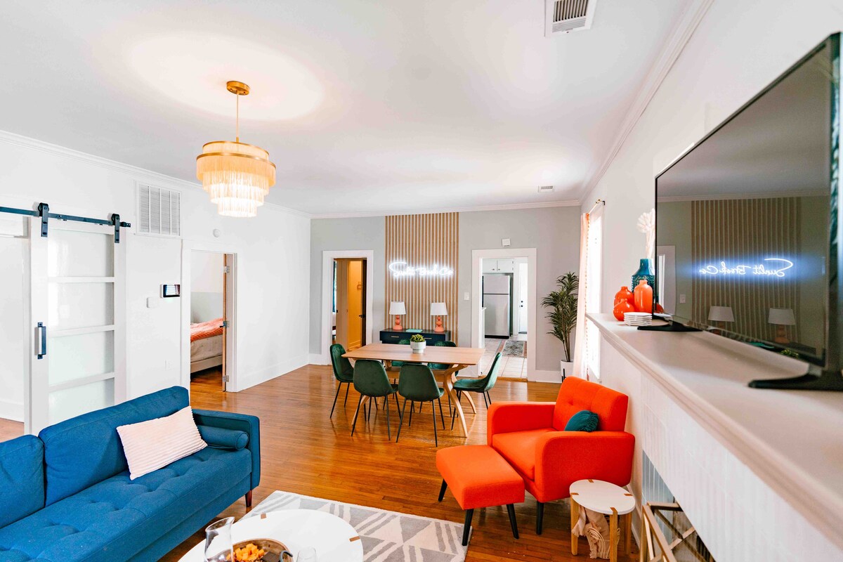 ¡Ven a experimentar la sensación moderna de Boho mientras estás a 3 manzanas de decenas de restaurantes, tiendas, salones y mucho más! Esta acogedora casa de campo renovada, llamada «Dark Chocolate», ha sido diseñada por Sunlit Brook Co y tiene como objetivo complacer. Dark Chocolate puede alojar hasta 6 huéspedes con su combinación de salón/comedor abierto, cocina totalmente equipada, 3 dormitorios y 1 baño y medio. Con el acogedor porche delantero y la sala de estar del patio trasero, ¡Dark Chocolate está lista para alojarte durante tu fin de semana, semana o mes!