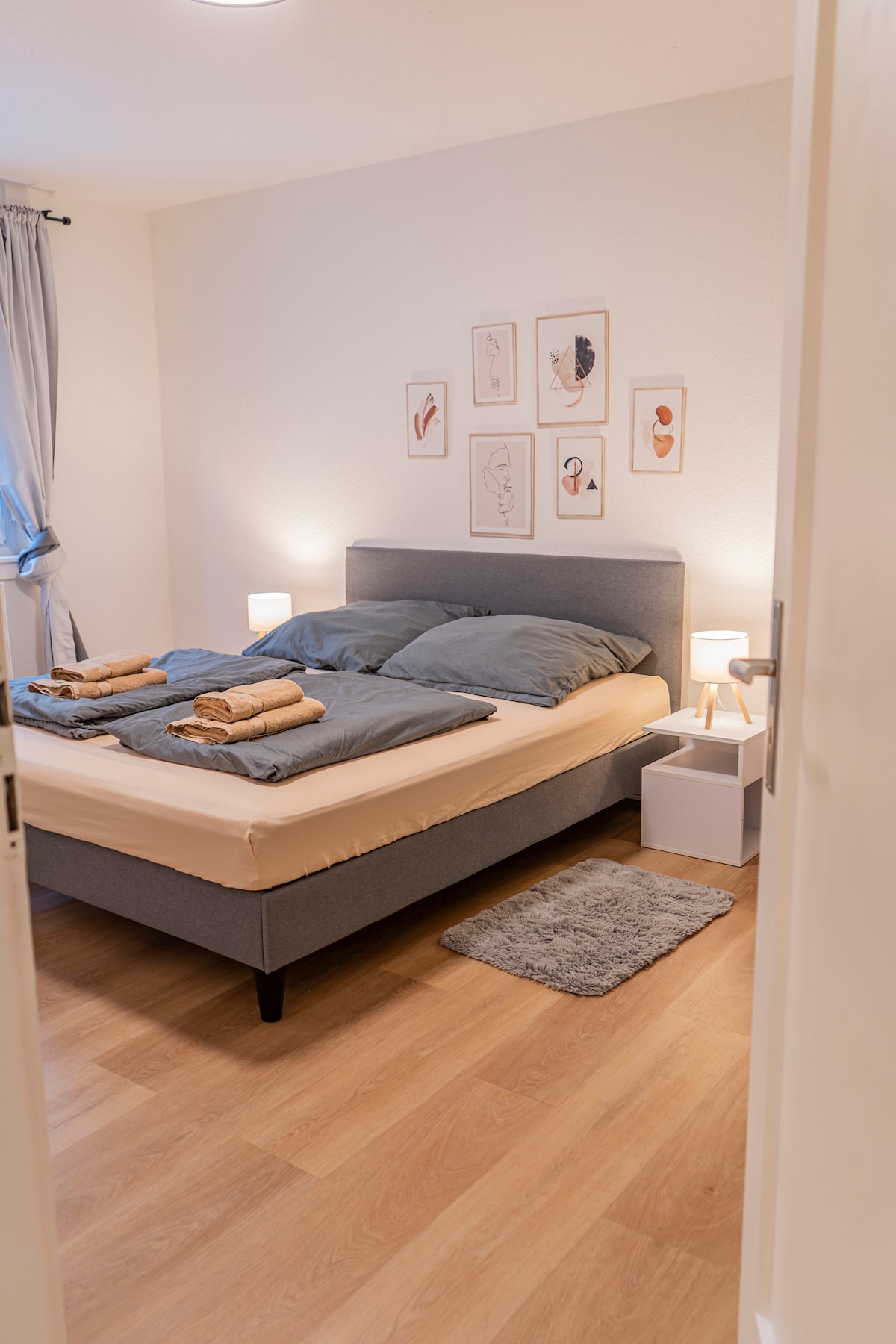 Neue Dachgeschoss Wohnung am Rande eines Naturschutzgebietes. Offener stielvoller klimatisierter Wohn/Essbereich mit 3. Schlafgelegenheit (ausziehbare Schlafcouch), großer TV. Vollausgestattete Wohnküche, modernes Duschbad inkl. Waschtrockner, Handtuchheizkörper. Schlafzimmer: großzügiges Doppelbett , Kleiderschrank, separater Arbeitsplatz inkl Monitor. 40m^2 große Dachterrasse mit Blumen, Kräutern. Blick ins Grüne. Fußläufige Einkaufsmöglichkeiten Supermarkt+Bäcker. Lademöglichkeit für E-Autos