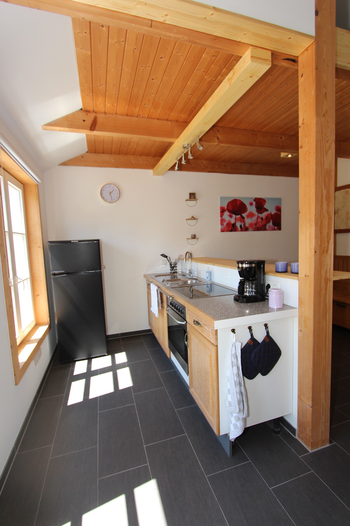 La casa de vacaciones consta de una luminosa sala de estar con cocina, baño y aseo independiente. En el exterior, la sauna invita a relajarse y, de abril a finales de octubre, podéis dejaros llevar en la piscina termal exterior. El baño con ducha está separado de la sala de estar por una puerta corredera. La cocina está totalmente equipada. En la sala de estar hay una cama individual, que se puede retraer. En la pequeña galería hay una cama doble. En la sala de estar hay un sofá cama.