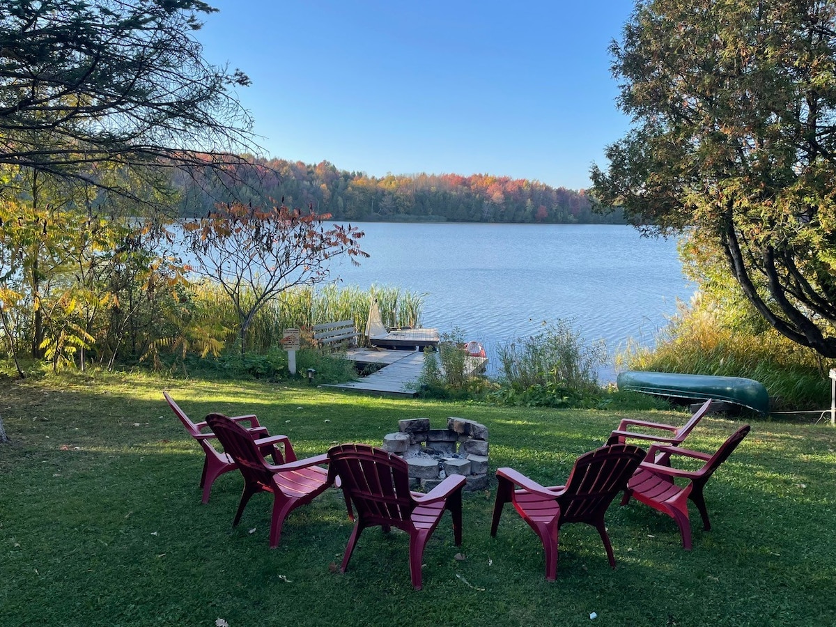 Hermosa casa de madera de tronco con un techo de la catedral y una estufa de leña, situada justo a orillas del lago Desmarais en Estrie. El muelle es el lugar ideal para relajarse. El lago privado es un área protegida (no se permiten motores a gas) y está repleto de truchas y otras especies de peces cada año. Una tabla de remo, canoa y kayak estarán a tu disposición. La bañera de hidromasaje está disponible para su uso durante todo el año. A partir de enero de 2021 : 1 reservación = 1 árbol replantado a través de Tree Canada
