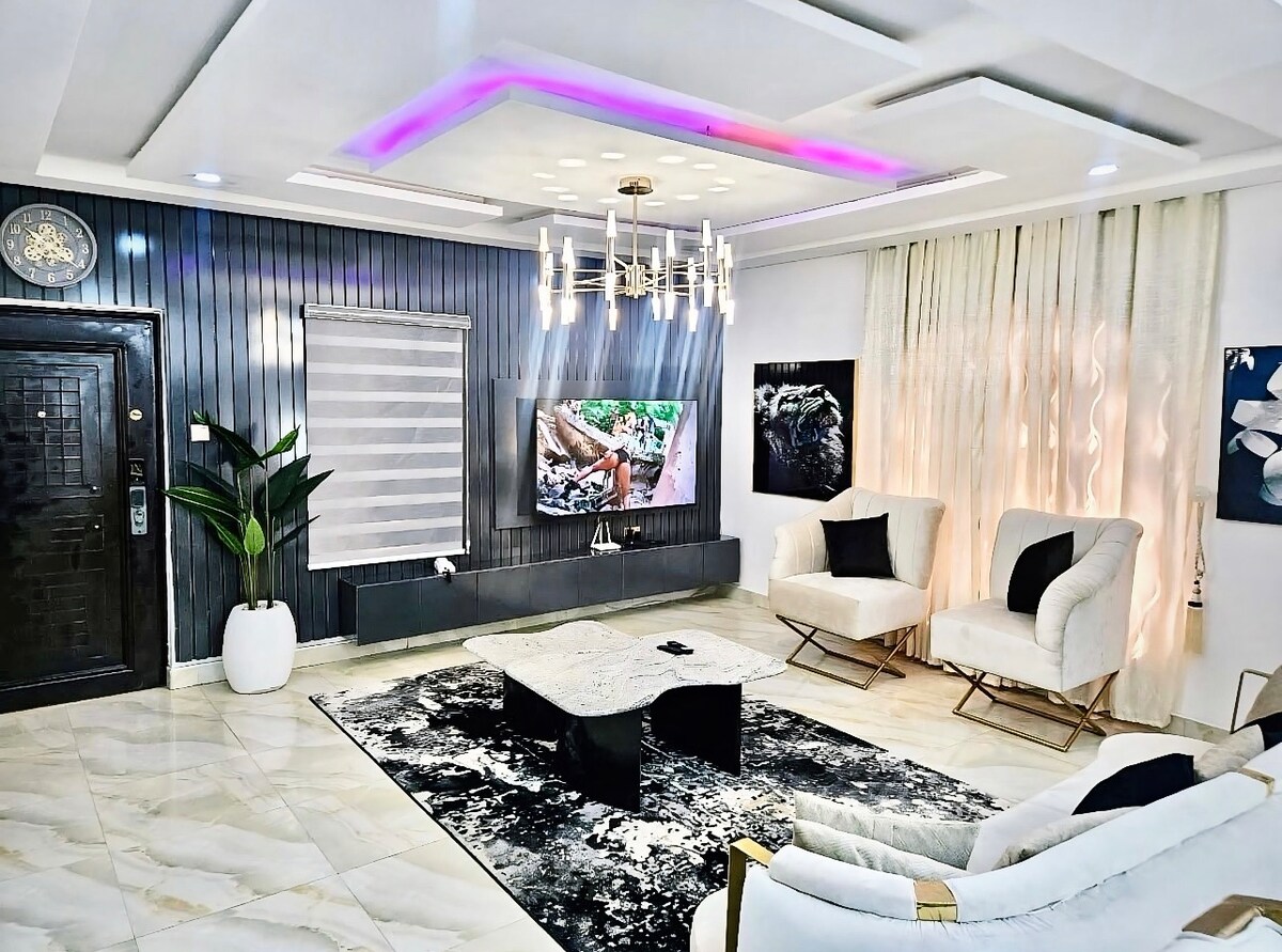 ¡Bienvenido a tu exquisito hogar lejos de casa! Decorado en tonos tierra y crema para mejorar la relajación. Disfruta de una estancia inigualable en nuestro elegante y moderno apartamento situado en el corazón de la ciudad. Ideal para estancias cortas, viajeros de negocios y exploradores de la ciudad que buscan comodidad y conveniencia. El apartamento se encuentra a 5 minutos a pie de un supermercado y una farmacia y muy cerca de un mercado local. A 6 km del centro de la ciudad, Wuse 2.