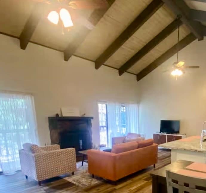 Relájate en esta cabaña boho a 5 minutos del lago, repleta de comodidades y rodeada de terrenos arbolados por todos lados. Dos dormitorios king de lujo, cada uno con un espacio de trabajo tranquilo y colchón king de 14 pulgadas. Una tercera habitación con juguetes, libros y 6 increíbles literas integradas con Beddys premium para un sueño acogedor. Amplia sala de estar, con chimenea acogedora y comedor para más de 10 personas. Amplia cocina de cocinero, con isla y despensa que incluye servicios de hogar. Además de la sala de juegos del garaje: ¡ping pong, futbolín y baloncesto de arcade! ¡Descansa y recarga!