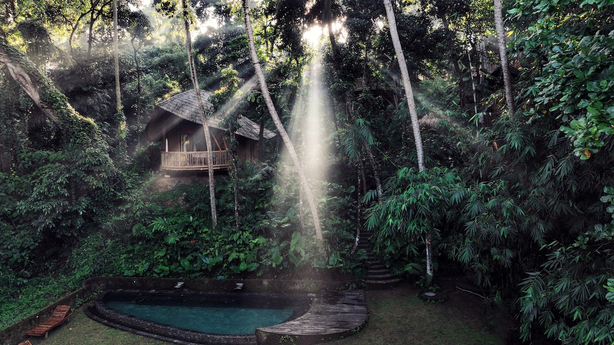 Un cómodo bungalows de bambú con vistas al río que forma parte de 5 exclusivas cabañas discretamente enclavadas entre árboles. Construido y equipado de forma sostenible con la huella más pequeña de su entorno Observa aves desde la comodidad de tu hamaca en tu balcón privado o relájate junto a la piscina infinita de 12 m con vistas al río Una vez revitalizado por la naturaleza, puedes dirigirte 15 minutos al norte hasta el bullicioso centro cultural de Bali, en el centro de la ciudad de Ubud, o conducir 20 minutos hacia el este hasta la playa de arena negra más cercana de Saba.