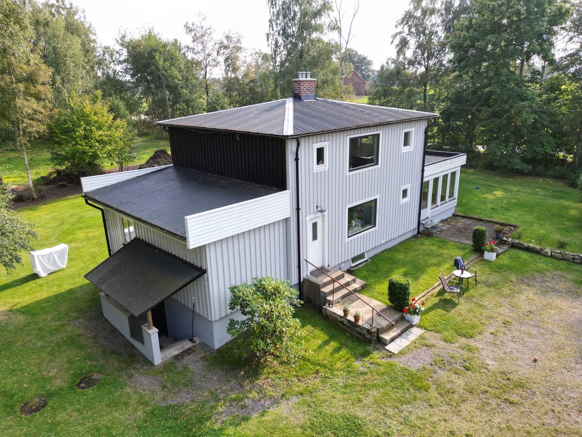 Estudio muy fresco y luminoso en la segunda planta con cocina, mesa de comedor, cama doble y sofá cama. Salida de la habitación a terraza propia con vistas al oeste y al bosque y un campo. El baño con ducha está en la primera planta. A 5 km hay dos lagos con playa, a 15 minutos en coche de las playas de arena de la bahía de Lahoms, cerca de bosques y parques naturales. A unos 30 minutos en coche de la estación de esquí de Vallåsens en Hallandsåsen. Hay disponible una cuna de viaje para bebés.