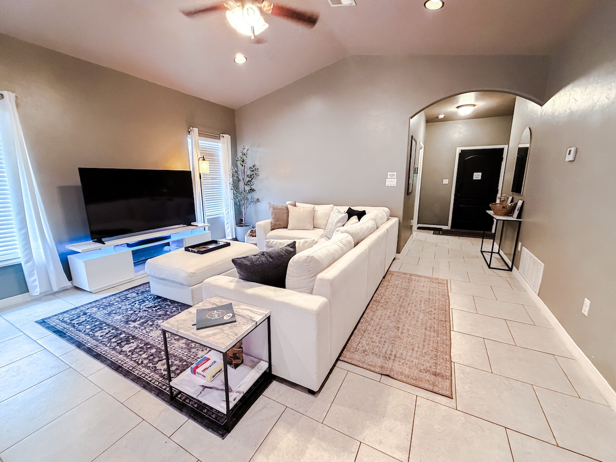 Disfruta de esta hermosa casa con tu familia cuando visites Carlsbad, Nuevo México. Esta nueva casa de 3 dormitorios y 2 baños se encuentra en un barrio nuevo, limpio y seguro en el lado norte de Carlsbad. Juega al ping pong, a los juegos de arcade de Pac Man, a los juegos de Snes, cena bajo el cenador o asa nubes en la hoguera: ¡te va a ENCANTAR esta casa! ¡2 dormitorios tienen camas tama king con fundas nórdicas que se lavan después de cada huésped! La habitación con litera tiene 2 camas completas y una televisión con una consola de juegos.