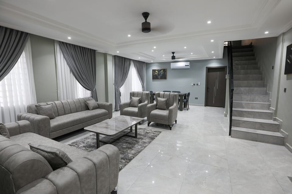 - 3 dormitorios y 2 baños (1 privado en suite, 1 principal). - Sala de estar con TV inteligente de 55 pulgadas. - Cocina totalmente equipada (incluye lavadora). - Agua caliente - Comedor. - Entrada privada. - Zona de barbacoa/parrilla. - Wifi de alta velocidad. - Aparcamiento gratuito (hasta 3-4 coches) - Cámaras de CCTV y vallas eléctricas para tu seguridad. - Servicio de limpieza gratuito cuando sea necesario. - Llegada autónoma con nuestro conserje 24/7. *GENERADOR DISPONIBLE PARA CORTES DE ENERGÍA ¡Perfecto para familias, turistas y viajeros de negocios!