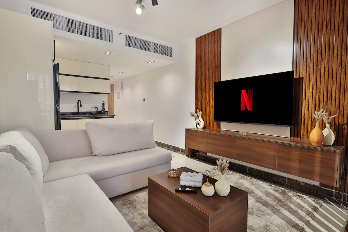 استوديو فاخر بتصميم مودرن وأجواء هادئة، ideal para parejas y viajeros solos. Disfruta de un estudio de lujo con bañera independiente, iluminación moderna y cálidos acabados de madera para una estancia relajante. 📍 Ubicación privilegiada cerca del centro comercial City Stars, Nasr City TV ✔️ inteligente ✔️ Wifi rápida ✔️ Aire acondicionado ✔️ Cocina pequeña totalmente equipada ✔️ Espacio de trabajo para el trabajo remoto ✔️ Planta baja: acceso fácil Perfecto para estancias románticas, viajes de negocios o escapadas urbanas cortas. Limpio, elegante y privado.