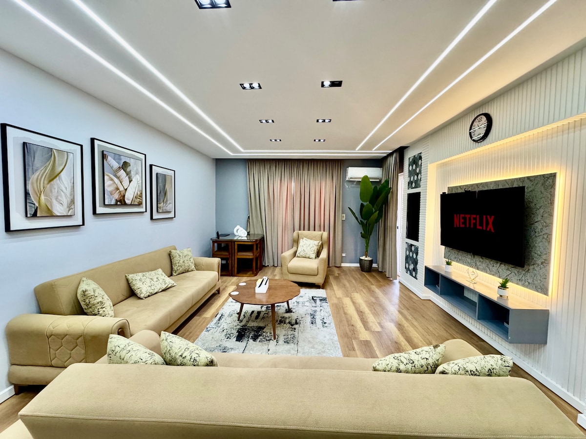 ¡Te damos la bienvenida a tu escapada perfecta! Este encantador y elegante apartamento cuenta con 2 elegantes dormitorios y un elegante área de recepción, por lo que es ideal para familias o amigos. Relájate en la máxima comodidad con un juego de lujo Lazy Boy y una iluminación elegante que agrega un toque cálido y con clase La decoración de moda y el ambiente acogedor crean un ambiente acogedor que se siente como en casa. Este departamento es elegante y ofrece un ambiente sereno y refrescante A 5 minutos del centro comercial, el mercado y el patio de comidas. *** 15 minutos del aeropuerto ***