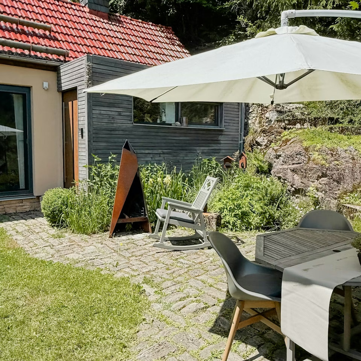 Nuestra casita en el campo es un bungalow independiente en una hermosa parcela ajardinada de 900 metros cuadrados en las afueras de Leipzig. La propiedad con un gran garaje (mesa de ping-pong y saco de boxeo), trampolín y slackline está a su entera disposición. El mobiliario es abierto, luminoso y de alta calidad y te invita a sentirte bien y relajarte.