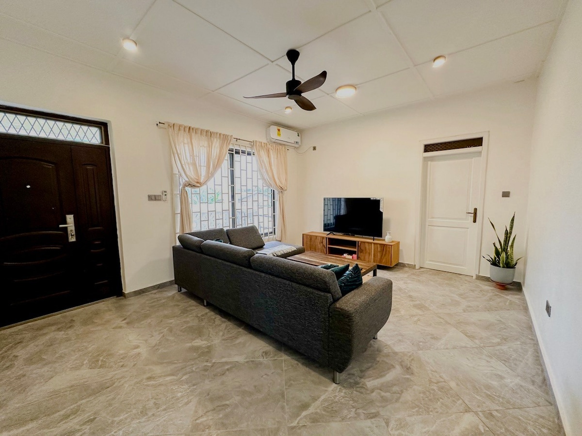 Escape to our luxurious 2-bedroom apartment, perfect for families & groups Enjoy: -Blazing Fast WiFi for work & streaming like Netflix -Big & cosy king-sized beds for a perfect sleep -Gated compound with electric fence, parking space for up to 7 cars, automated gate. -🌼Garden with soothing fountain and kids play area -Outdoor sitting area for relaxation/smoking -Connects you easily to Cape Coast & Elmina Castles 🏰Kakum Park, restaurants. Book now & experience the best of Ghana hospitality