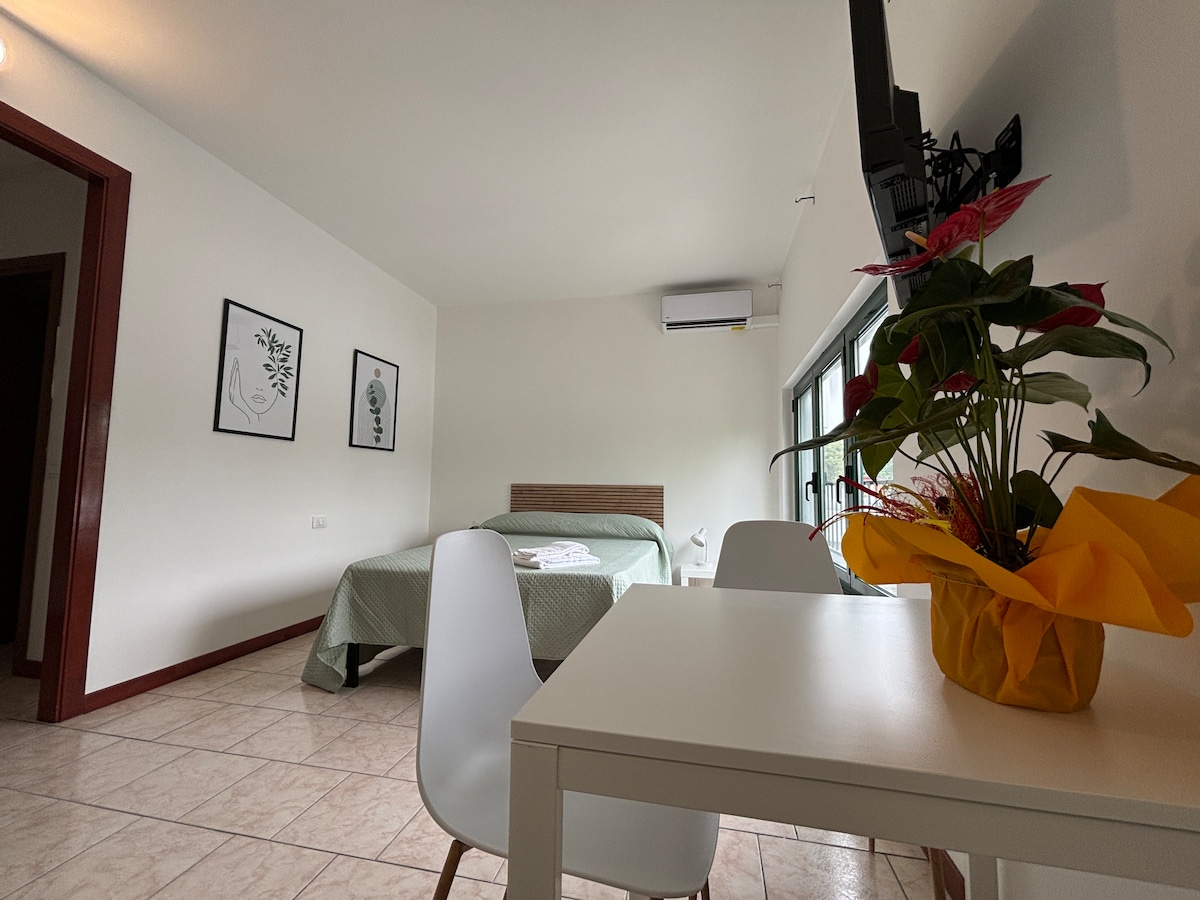 Amplio apartamento estudio con baño privado y cocina americana, conexión rápida a Internet, TV vía satélite, aire acondicionado y calefacción, espacio común con lavadoras y secadoras. El apartamento forma parte de una estructura que consta de otras 18 unidades, todas para uso turístico. Ubicación estratégica entre Mantua, Verona y Mirandola. Tarifas con descuento para estadías largas.