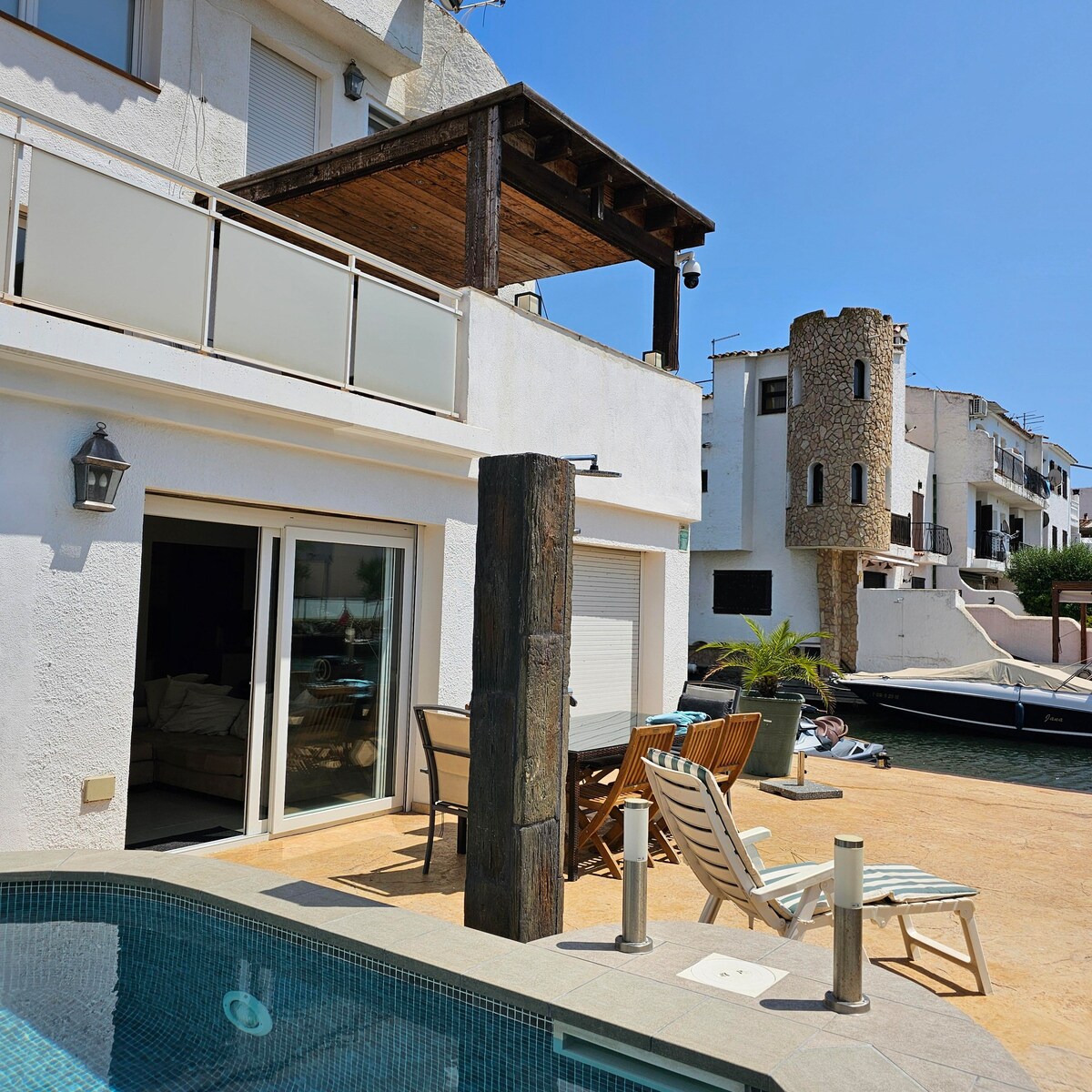 Bonita casa moderna en Empuriabrava con acceso directo al canal, que tiene su amarre privado de 7x3m frente a la casa Bien equipada, tiene 3 dormitorios con capacidad para 8 personas y 2 baños. Tiene aire acondicionado y calefacción. La casa tiene una terraza con vista al canal y equipada con una plancha y una mesa de comedor y en el último piso otra terraza con vista al canal y a la montaña se proporcionan sábanas y toallas para estancias de 7 noches o más