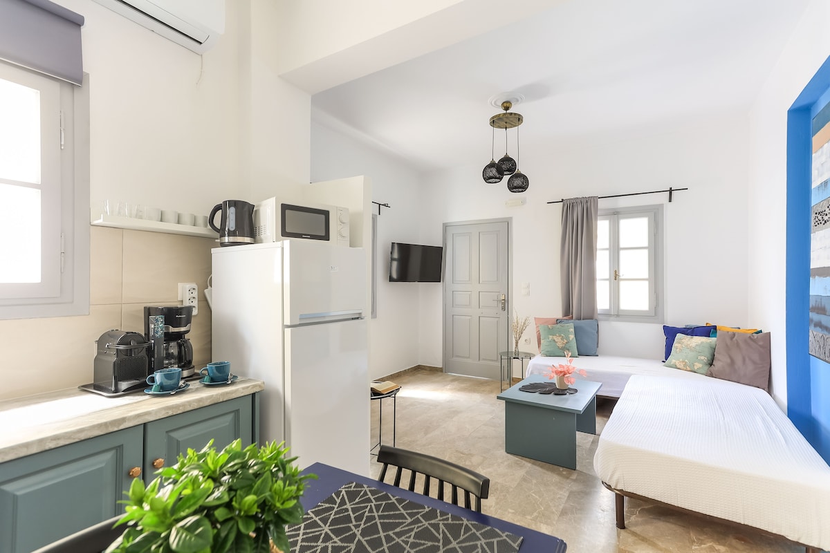 Ubicación ideal a solo 50 metros de la playa de Kamari, cerca de los mejores hoteles, bares y restaurantes. El barrio es tranquilo y todo lo que necesitas está a muy poca distancia. Hay muchos minimercados y supermercados alrededor, la estación de autobuses local está a 3 minutos a pie y hay aparcamiento público cerca de la propiedad. El apartamento está completamente renovado en una combinación de un diseño moderno y tradicional de Santorini muy acogedor. Este apartamento consta de una cocina totalmente equipada y un baño privado.