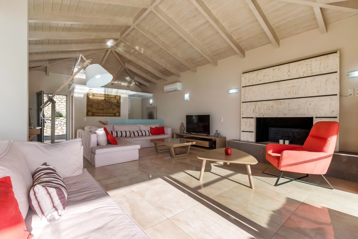 Relájate en una terraza en la ladera de una colina con vistas al mar mientras la refrescante brisa marina fluye durante todo el día. Por la noche, el aire lleva el aroma del jazmín y la madreselva. El ambiente sereno continúa en el interior con plantas en macetas, elegantes muebles empotrados y una decoración de buen gusto en tonos tierra apagados. La iluminación y otros detalles completan la serenidad. La casa tiene un ambiente relajado y espacioso, que combina arquitectura moderna con elementos tradicionales. Podrás disfrutar de materiales de alta calidad, techos altos, luz divertida y lino fino. Hay un altavoz bluetooth disponible para disfrutar de tu música favorita desde tu ordenador. Los dormitorios tienen baño privado. Se proporciona una cocina totalmente equipada con lavavajillas y cafetera espresso. Hay una barbacoa de piedra disponible. Para los meses más fríos, hay una estufa de pellets junto con mantas eléctricas que dan una sensación cálida. Tienes acceso a nuestro propio huerto, según la temporada, por supuesto. Estoy disponible en todo momento para cualquier ayuda que necesites. Aunque la isla de Ithaki es pequeña, tiene muchos tesoros escondidos. Será un placer ayudarte a explorarlos. Cualquier servicio relacionado con las vacaciones, como alquileres o reservas, se puede reservar bajo petición. La isla de Ithaki es un lugar bastante íntimo con muchos tesoros por descubrir. La casa se encuentra en el pueblo de Ag. Saranta, un asentamiento tradicional en la parte norte, con vistas a la bahía de Afales. La playa cercana con aguas increíbles está a 5 minutos en coche. El pueblo de Stavros, con todos los servicios, y el pueblo pesquero de Frikes están a 1,5 kilómetros. Por desgracia, no hay transporte público en Ítaca. Es muy recomendable alquilar un coche. El acceso a Ithaki es a través de Cefalonia, Patras, Astakos y en los meses de verano desde Lefkas también.