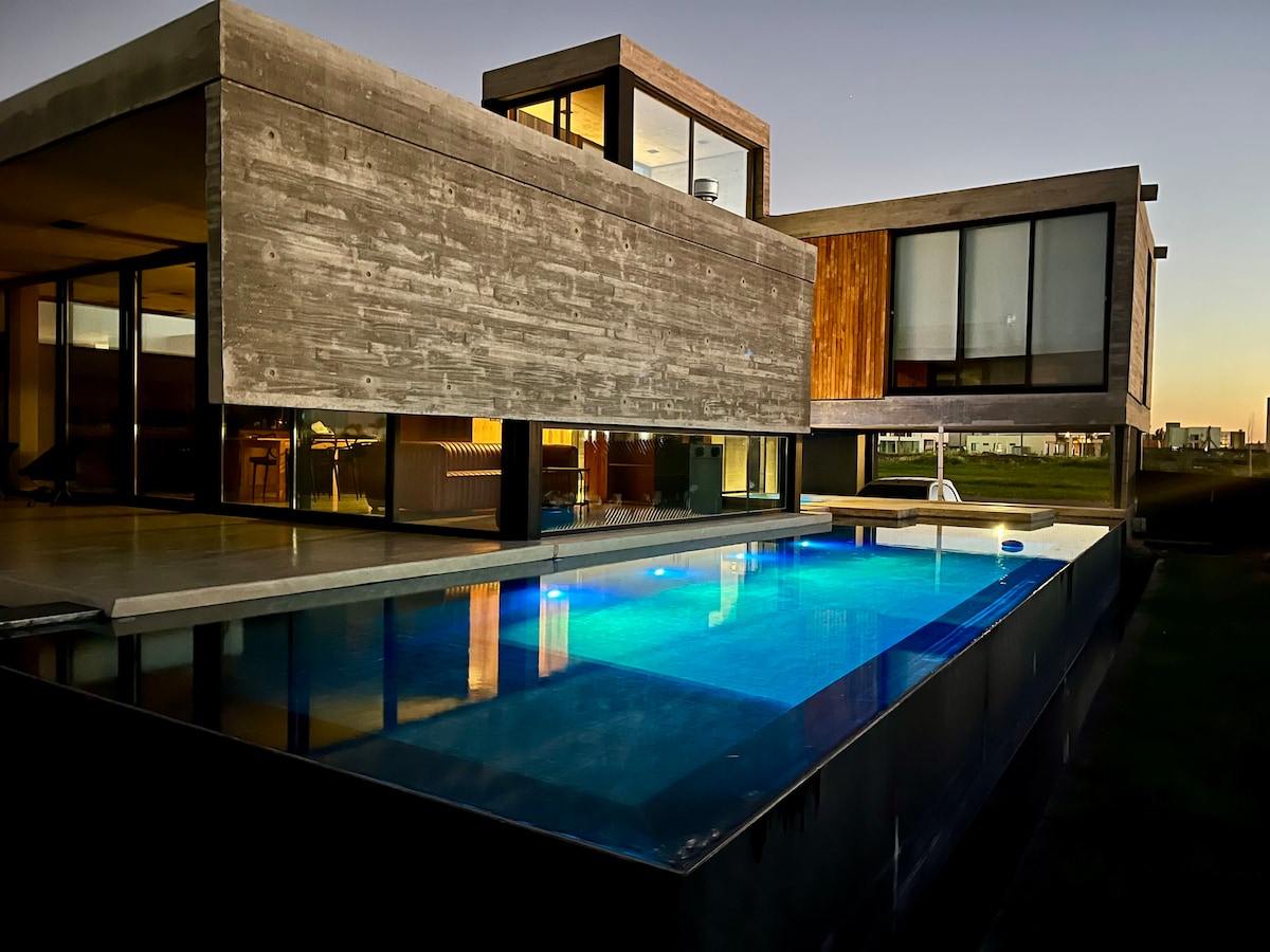 Casa en barrio privado inaugurada en marzo de 2022, diseño único mid-century modern. Amplia, funcional y acogedora. Aire frío/calor en todos los ambientes. Calefacción por losa radiante. Gran parrilla, anafe y horno eléctricos, artefactos de 1ra, aberturas doble vidrio y galería con los mejores atardeceres por su orientación Noroeste. Jardin con salida a amplia laguna. Cama California king en suite. Colchones de 1ra. Wifi alta velocidad. ::No se permiten eventos, mascotas o invitados extra